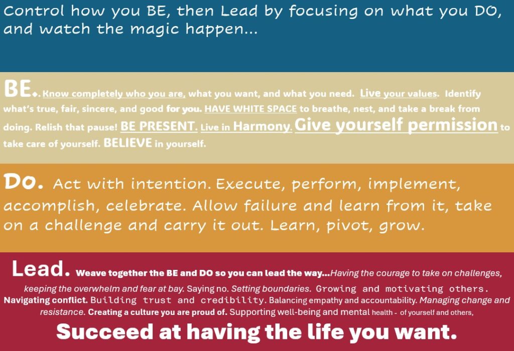 Imagine a typical day packed with deadlines, people vying for your attention, last-minute problems to solve, and challenging conversations to navigate —both at work and at home. Yet, in the midst of it all, you operate with calm, focus, and control. How is this possible? Because you take the time to BE with who you truly are, focusing on what you can DO and experience the full breadth of your power every day.